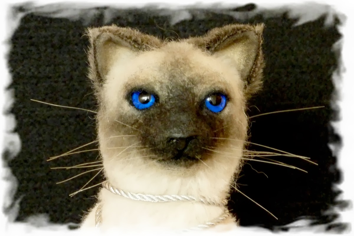 SAPPHIRE the Siamese kitten ADOPTED thank you! Sapphire is OOAK. He comes with his embroidered felt ball, silver rope pendant and birth certificate in matching materials. MEASURES: height (top head to floor) 8 inches (20 cm) when sitting. MATERIALS: light beige alpaca. Ultra suede for paws and inner ears FEATURES: face is needle felted. Whiskers made with horse hair. EYES: blue German glass. I hand painted them for a deeper realistic look. NOSE: needle felted and sealed. JOINTS: hind legs are cotter pin jointed. A wiring connects head to body. Tail and legs are wired. STUFFING: sheep wool and encased white granulate for ded weight. SHADING: oils and acrylics. |